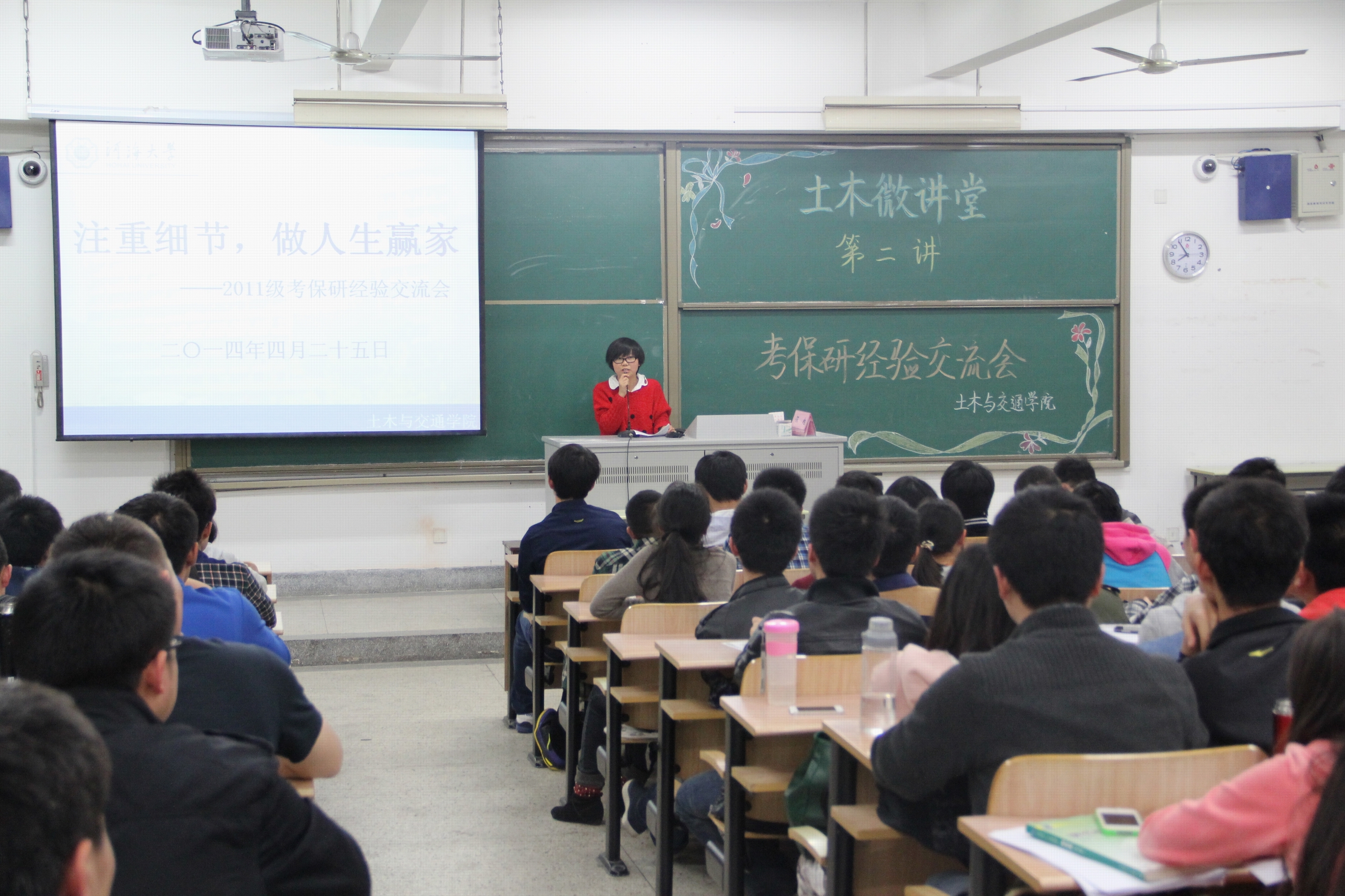 首先,保送本校岩土工程直博生的李春红同学从保内方面与同学们分享经验。她分享了保研复试面试时的相关细节,并告诫大家应根据自身兴趣和实际情况选择导师。随后,保送到同济大学桥梁工程的李培军同学根据自身经历从保外流程、联系导师、保研复试等方面介绍了保外方面的经验,建议保外同学组成团队互相帮扶,尽可能获取更多外校信息。接着,成功考取同济大学结构工程的张石钰同学和考取公司结构工程专业的王震赛同学,分别从考研准备流程、推荐参考书目等方面分享了各考研科目复习心得,并提醒同学们应坚定目标、严格要求,做到不动摇、不懈怠。台上激情飞扬、感慨万千;台下仔细倾听、认真揣摩。
