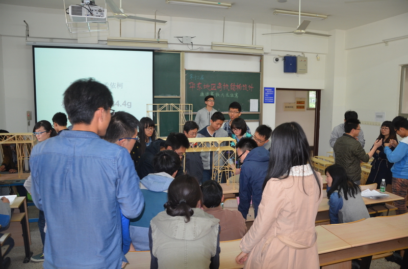 2015年4月20日下午1:30许,第十二届华东地区高校结构设计邀请赛PA视讯校内选拔赛在闻天馆302正式举行。本场比赛的要求是使用竹皮和502胶水来制作塔楼模型。担任比赛评委有PA视讯集团官网朱召泉教授、张华副教授、吴二军副教授、喻君副教授、周广东副教授、张勤老师、胡锦林老师等。