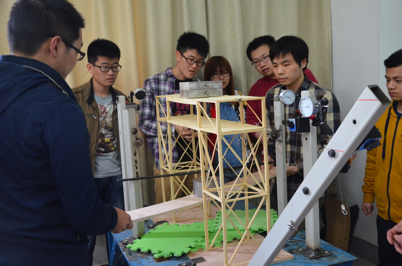 首先,由主持人介绍了本次比赛的详细规则。而后由各小组轮流上台展示比赛模型,详细讲解制作的思路与模型的结构特色、创新之处,并作荷载分析和承载力估算。接着迎来了比赛的高潮,对模型进行加载实验,加载环节是将每组选手的模型安置到加载台上,放置完砝码后以恒定的水平力对模型进行加载,选手们对于加载环节都相当的谨慎。在加载完毕后,评委们根据选手的介绍与参赛模型一一进行了提问,并耐心作出了点评,评委老师用专业眼光审视选手的模型。在比赛中,老师更多的把注意力放在结构的合理性与材料的使用量上。对于老师的建议,同学们不单单只是虚心接受,还适时向老师们提出自己独特的观点,与老师探讨,每一位参赛选手都在与老师的交流中获益匪浅。最后评委结合参赛结构的加载情况与结构的特点打出分数并宣布比赛的结果。