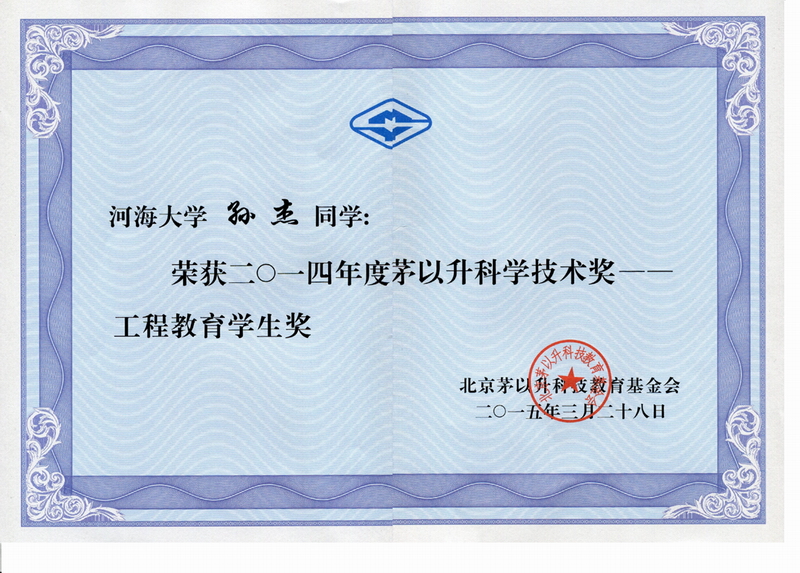 2015年5月26日,茅以升科技教育基金会第二十四届颁奖大会在西安举行。公司2011级土木工程专业本科生孙杰同学荣获2014年度“茅以升科学技术奖——工程教育员工奖”。