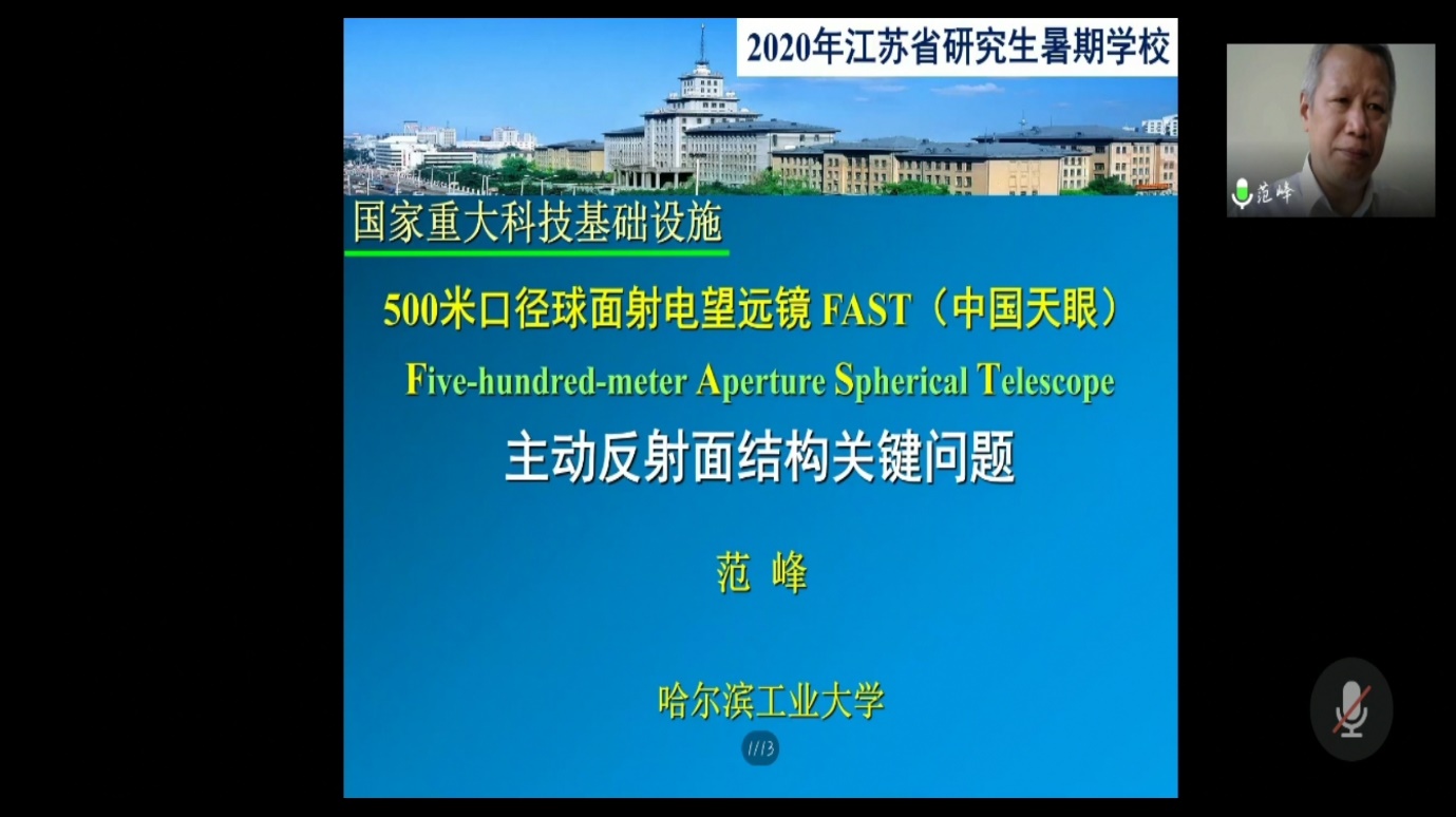 下午第一场报告的主讲人是哈尔滨工业大学范峰教授,他的授课题目为《500米口径球面射电望远镜FAST(中国天眼)主动反射面结构关键问题》。范教授首先向同学们讲述了中国天眼FAST的三大自主创新:主动反射面、轻型可变位馈源支承系统和独特的洼地台址,并重点就主动反射面结构系统的创新设计进行了介绍,并提出了FAST结构风振响应和非均匀温度场效应的分析方法。另外,范教授还介绍了FAST的若干重要结构性能分析,如参数敏感性分析和疲劳性能验算等。范教授的报告内容丰富,观点新颖,引起了同学们的积极响应,对于同学们提出的风荷载对圈梁的作用以及疲劳性能等专业问题,范教授详细地做了解答。