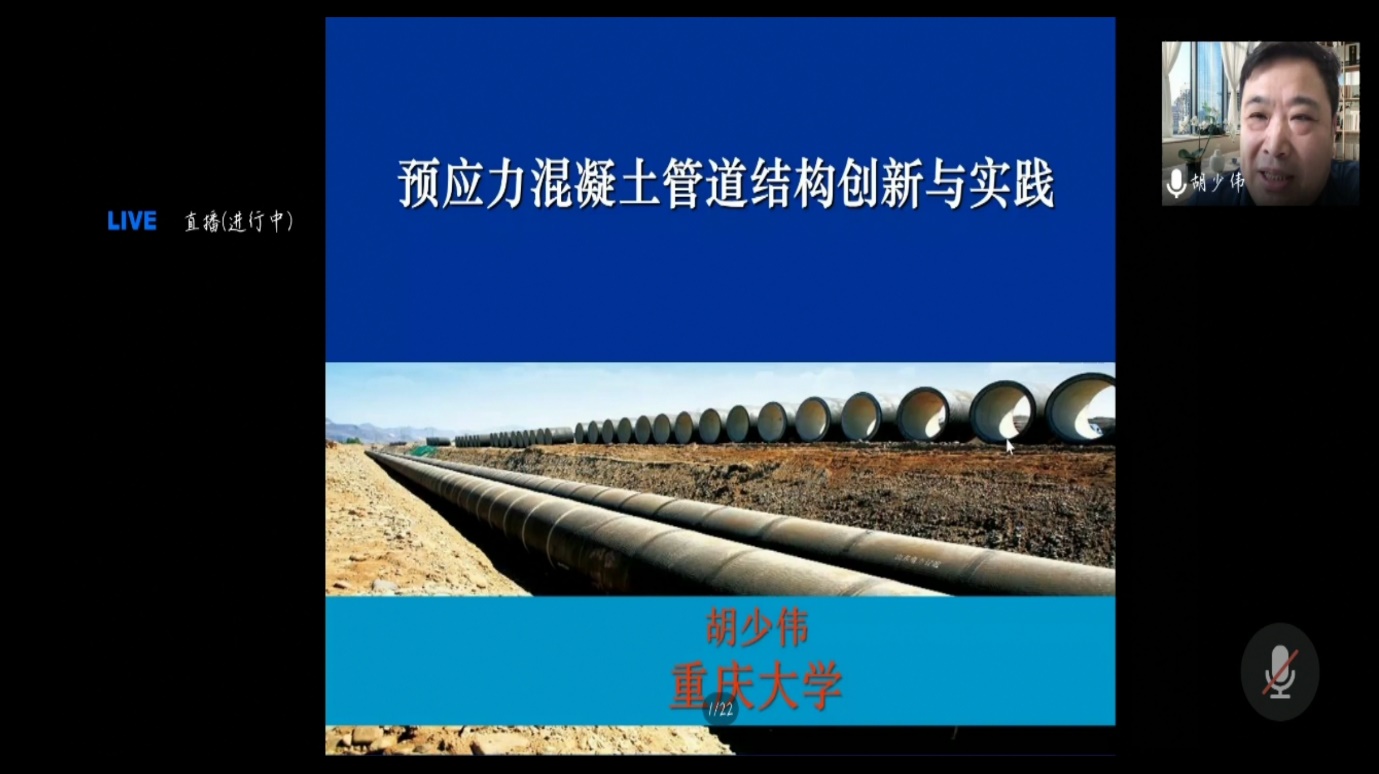 上午第二场学术报告的主讲人是重庆大学土木工程公司胡少伟教授,他的授课题目是《预应力混凝土管道结构创新与实践》。胡教授从预应力混凝土管道结构的国内外应用情况触发,介绍了超大口径PCCP管道结构安全与质量控制研究的最新进展,并展示了一种新型产品——钢筋缠绕钢桶混凝土压力管(BCCP)的结构理论、设计与试验研究成果,对预应力混凝土管道研究现状提出了几点思考并展望了下一步的工作。胡少伟教授的讲解大大的开阔了学员们的视野,勾起了学员们浓厚的兴趣。