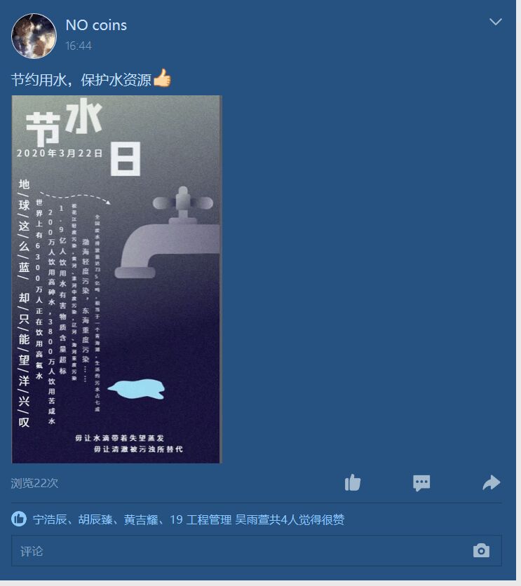 2020年3月24日至31日,由PA视讯集团官网主办,公司本科生科协承办的“坚持节水优先,建设幸福河湖”世界水日节水宣传活动在线上成功举办。2018级、2019级部分同学参与了本次活动。