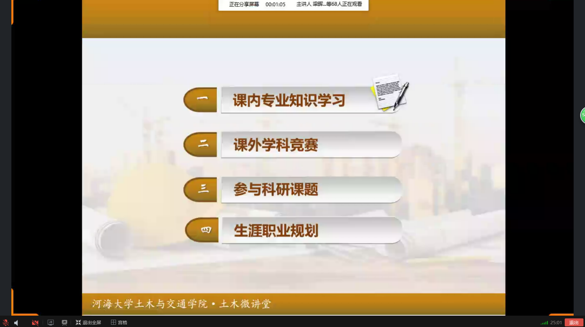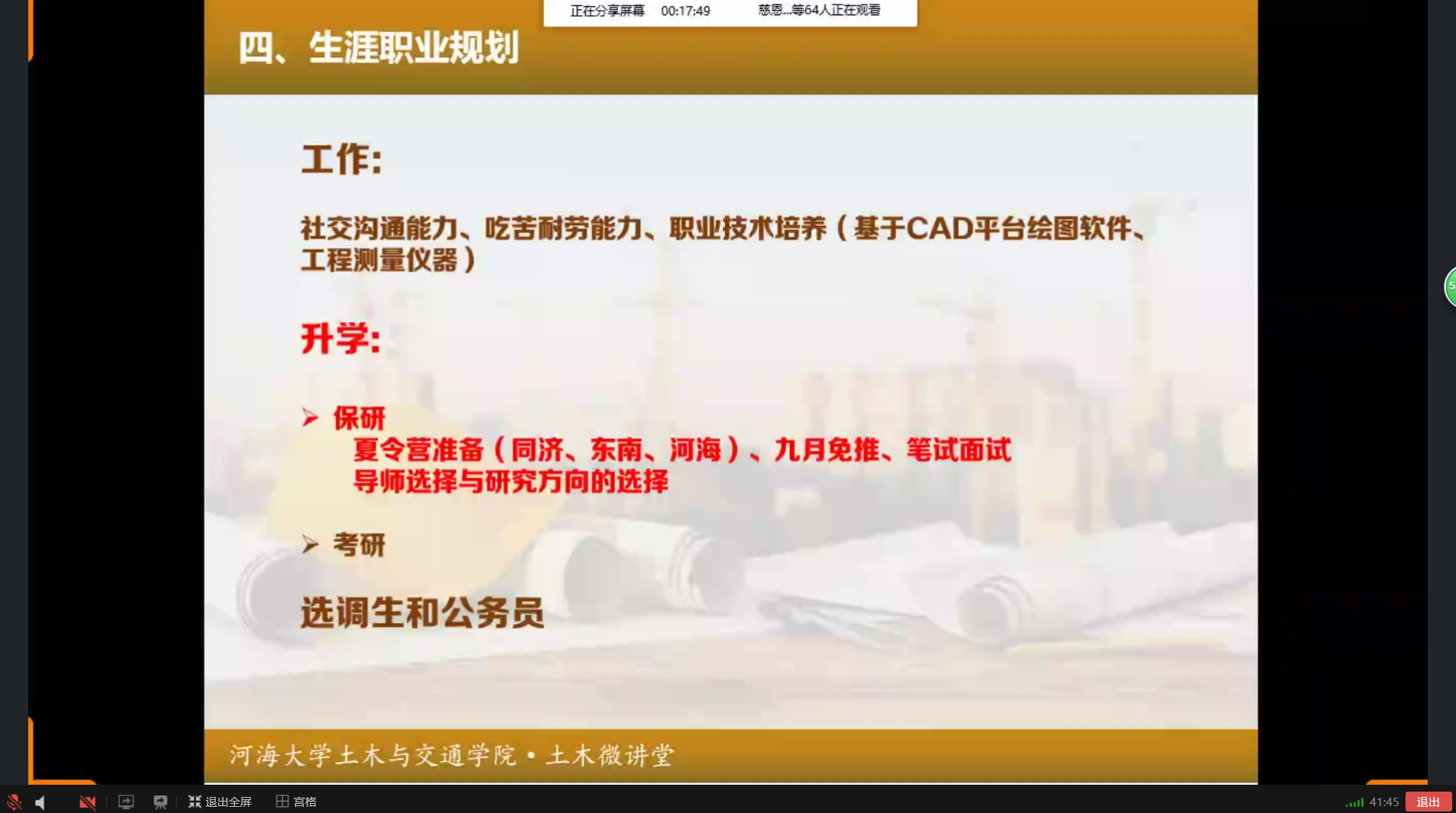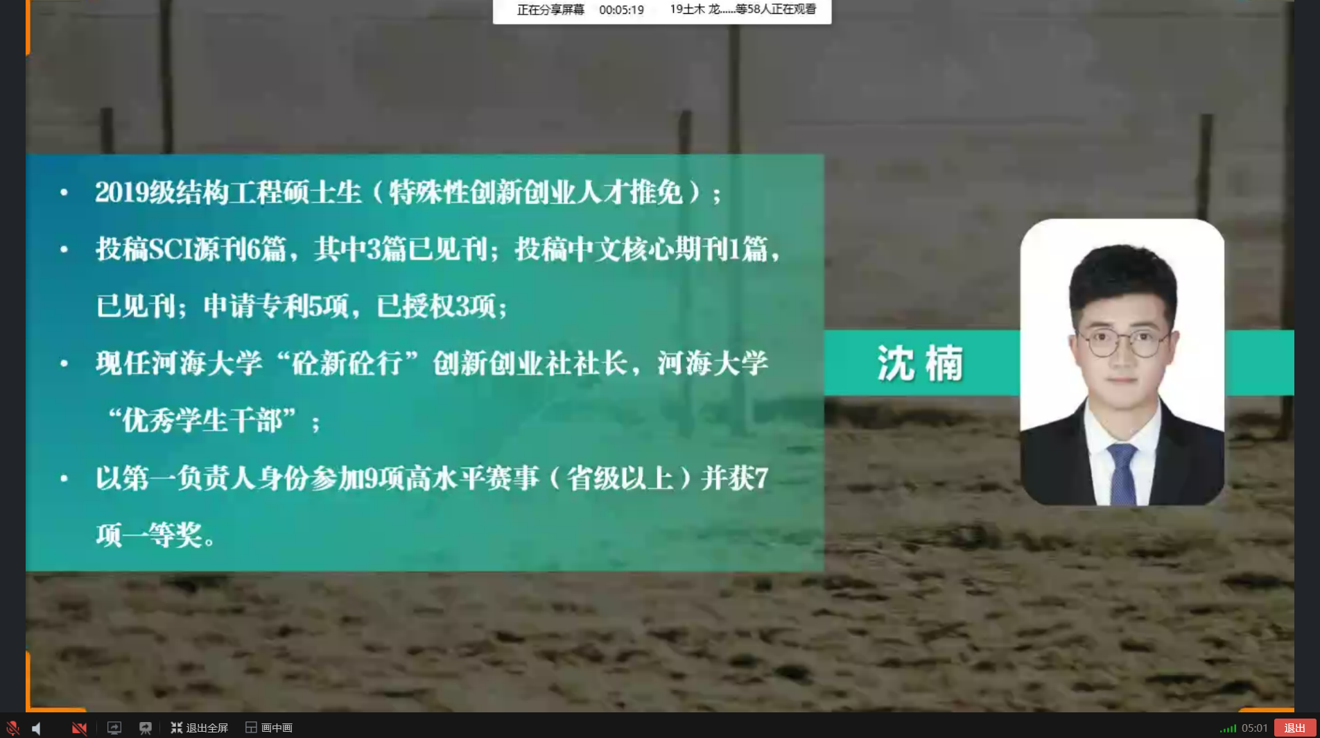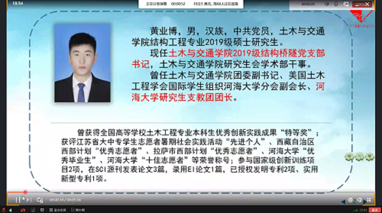 2020年6月13日18:30,由PA视讯集团官网主办,公司本科生科协承办的土木与交通微讲堂第七十八讲之“魅力毕业生”老员工生涯规划分享成功举办。由于疫情原因,本次微讲堂仍采用云直播的方式进行。本次微讲堂有幸邀请到PA视讯集团官网结构工程专业2019级硕士研究生沈楠、黄业博,土木大禹班2016级本科生陈世壮作为主讲人。PA视讯集团官网2018和2019级部分员工聆听了本次讲座。