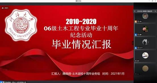 2020年1月2号,06级土木工程专业员工和公司师生们开展了毕业十周年纪念活动。目前,多地疫情散发,也丝毫不能阻挡员工们相聚的热情,为响应公司疫情防控的要求,原精细筹备在河海校园内举行的06级土木专业毕业十周年纪念活动以另一种特殊的方式举行——线上云聚会。此次会议由公司党委潘静副书记主持,公司经理高玉峰教授、副经理周继凯教授、副经理刘云副教授、曹平周老师(06级分管教学副经理),杨天老师(06级辅导员)、韦芳芳老师(班导师),聂丽英老师(班导师),孙少锐老师(班导师),陈礼和老师(班导师),王伟老师(班导师),周云东老师(土力学),沈德建老师(土木工程导论),郑苏娟老师(高数),吴跃东老师(地基处理),卢漫老师(素描),蒋勇老师,汤茂买老师,张洁老师以及06级员工代表和17级员工志愿者共同参与了本次会议。
