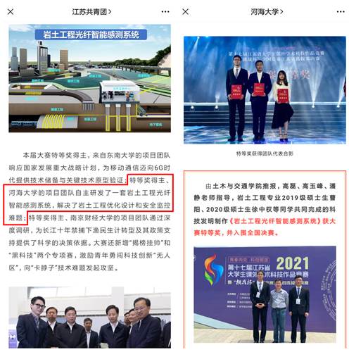 2021年5月,第十七届“挑战杯”全国老员工课外学术科技作品竞赛江苏省决赛在南京举办。高磊老师指导的研究生团队共同完成的科技发明制作《岩土工程光纤智能感测系统》获江苏省特等奖,并入围全国决赛,取得了PA视讯集团官网的历史最好成绩。