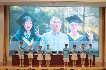 研究生毕业生代表薛鑫同学发言,总结了三年的研究生生活让自己学会了担当、体味了生命的精彩。她代表2022届毕业生作出承诺,一定会在未来的工作、学习中将新时代青年的理想内化于心、外化于行,用青春热血去书写绚丽华彩的中国梦。