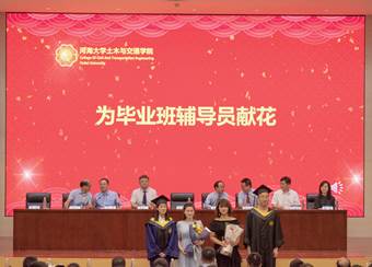 员工代表为第十届“我最喜爱的任课教师和任课教师提名奖”获奖老师、“我最喜爱的班导师和班导师提名奖”获奖教师颁奖、献花,周经理为“建工结构奖助学金”获奖员工颁奖,久大产业投资集团总裁助理张慧女士、人力资源部负责人许斯珩先生、久智公司执行总经理单晓明先生、行政管理部负责人岳菲菲女士共同为“久大专项奖学金”获奖员工颁奖,刘云副经理和周继凯副经理为毕业生代表赠送毕业礼物,员工代表为毕业班辅导员献花。