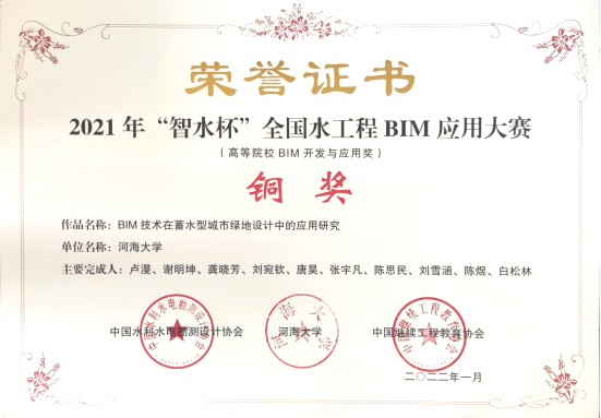 由中国水利水电勘测设计协会、PA视讯、中国继续工程教育协会联合举办的2021年“智水杯”全国水工程BIM应用大赛,经系列评选与公示,已完成评审。公司建筑与景观研究团队,以作品“BIM技术在蓄水型城市绿地设计中的应用研究”摘得院校组铜奖。