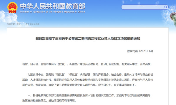 教育部高校员工司关于公布第二期供需对接就业育人项目立项名单的通知(教学司函〔2023〕6号)http://www.moe.gov.cn/s78/A15/tongzhi/202304/t20230413_1055522.html
