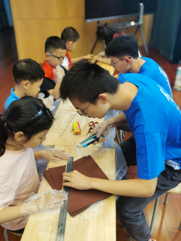 随后,为了让小朋友们将“知”与“行”结合起来,志愿者们带领他们现场进行了模型制作活动。从丈量长度到打磨材料,再到设计模型和搭建框架,志愿者们耐心指导,手把手教他们制作桥梁模型。在热烈欢快的氛围下,小朋友们卯足了劲,个个兴致高涨,很快就完成了自己的小小桥梁。