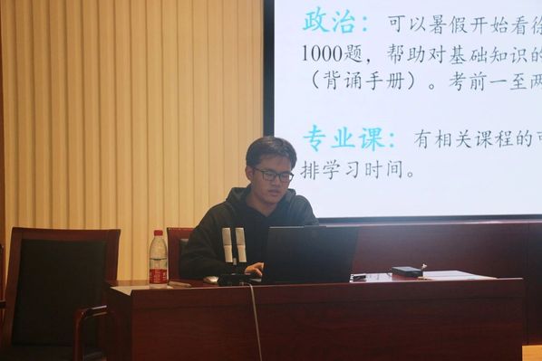 马俊潇同学就本科阶段成绩和科研成果对考研的影响进行分享,他表示本科的成绩是考研的基础,能否顺利毕业关系到研究生能否入学,科研成果能帮助大家在复试中脱颖而出。同时他还对各科的分数线进行难度分析。