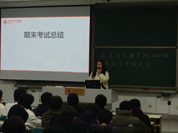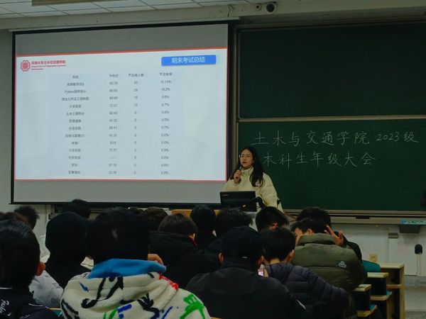 会上,胡锦蓉老师进行了第一学期学期的期末总结,为同学们展示了公司上学期的期末成绩,分析各科目均分、挂科率等,并寻找出现的问题,总结经验和改进方法。此外,胡老师还为同学们讲解了学分、绩点、保研推优等相关信息,解答了同学们相关方面的疑惑。