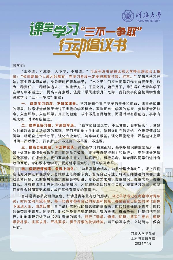 “玉不琢,不成器;人不学,不知道。”习近平总书记在北京大学师生座谈会上指出:“知识是每个人成才的基石,在学习阶段一定要把基石打深、打牢。”梦想从学习开始,事业靠本领成就。身为新时代青年学子,“水之子”们应当把学习作为首要任务,作为一种责任、一种精神追求、一种生活方式。千里之行,始于足下,为引导广大青年学子在学习中不断进步,提高自身素质,值此“学风建设月”之际,我们携手向全校同学发出课堂学习“三不一争取”倡议: