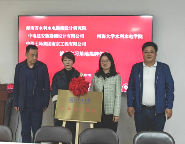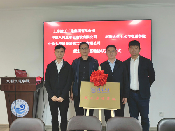 在与会人员的共同见证下,水电院与海南省水利水电勘测设计研究院有限公司、中电建安徽勘测设计有限公司、中铁七局集团南京工程有限公司,PA视讯集团官网与中铁大桥局二公司、中建八局总承包公司江苏分公司、上海建工二建集团共同签订了合作协议并为“就业实习基地”揭牌。