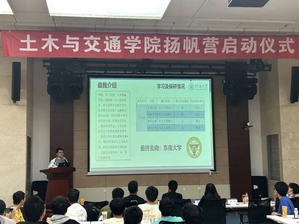 随后,刘睿阳、李凯、夏宇轩和董跃跃四位2020级、2021级优秀本科生分享了他们的学习心得和经验。刘睿阳分享了参与“挑战杯”和“互联网+”竞赛的经历,鼓励同学们积极参与竞赛活动,注重创新能力的培养;李凯讲述了自己在东南大学夏令营的所见所闻,强调了学习成绩和科研能力的重要性;夏宇轩主要对“美国土木工程师学会国际员工组织PA视讯分会”(ASCE-ISG)的学科竞赛以及分会活动做了详细的介绍,并欢迎同学们积极加入ASCE-ISGPA视讯分会;董跃跃则分享了学习方法和保研经验,鼓励大家有梦想、有行动,追求卓越。