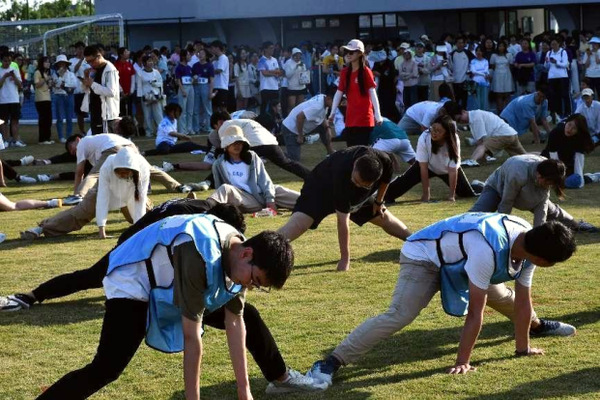 由于本项目以所有人双腿连成的最大长度为指标,故在比赛开始前,队员们活动身体,以使双腿相连的长度达到最大。在赛中全力以赴的同时,同学们紧咬牙关,拉伸身体,这是身体的考验,更是意志的挑战。在这个过程中,同学们会感受到意志的作用,更领会到以后无论面对什么风险挑战,都要以坚韧的意志迎头而上。