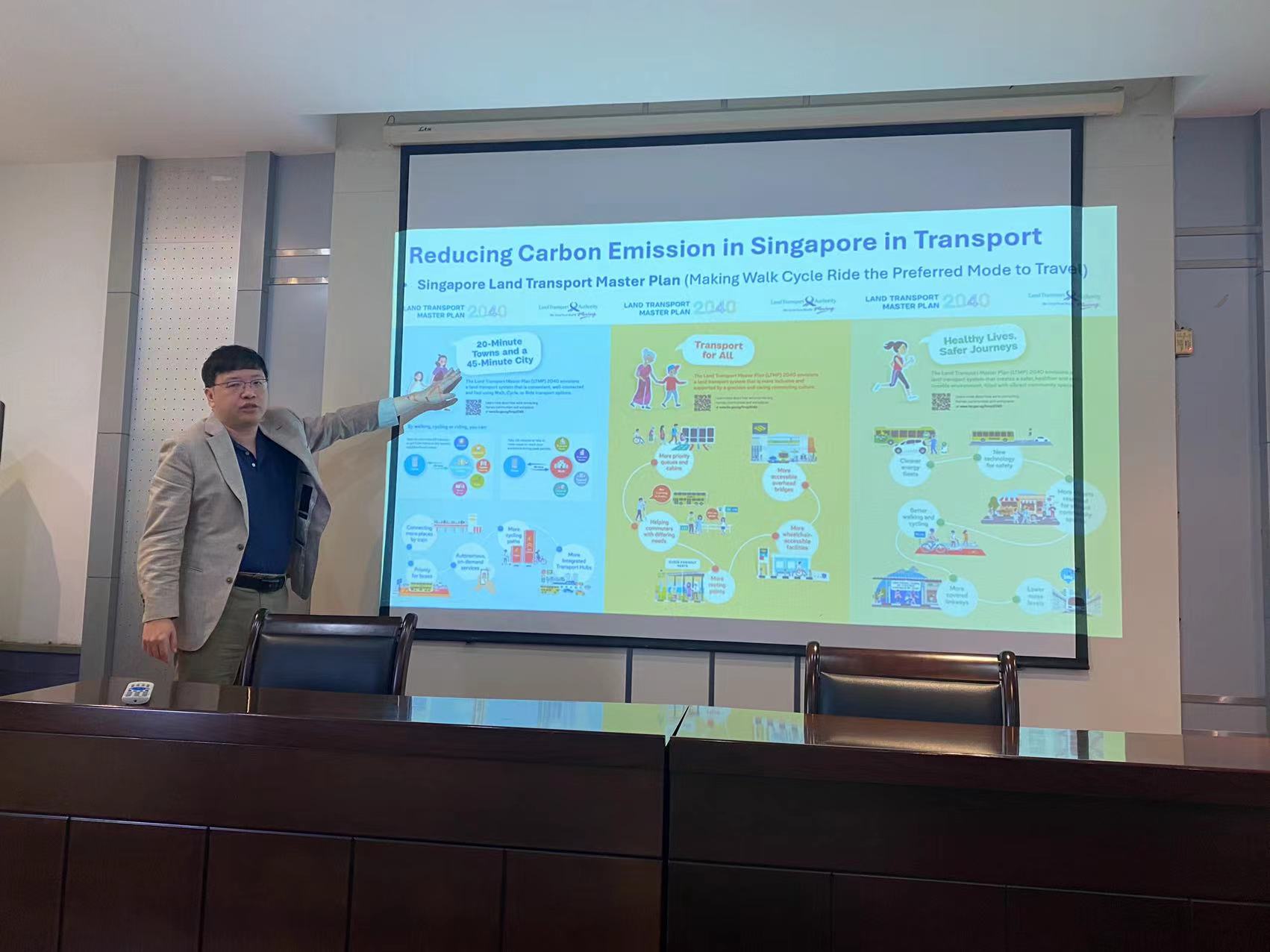 讲座中,王锦彬主任首先介绍了新加坡国立大学近年来在可持续交通模式及少车城市转型领域的最新研究成果,具体涉及电动汽车、自动驾驶汽车、公共交通、骑行和步行等多种出行方式。他详细探讨了如何将这些交通模式有效地整合到城市和交通规划中,以实现更少车的城市环境,并缓解交通拥堵、改善空气质量和提升城市宜居性。