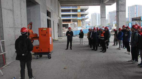 发展智能建造是以科技赋能建筑工业化、数字化、绿色化转型的重要举措,南京是智能建造24个试点城市之一。为亲身感受智能施工机器人在工程智能建造中的应用情况,公司师生前往中建八局公共安全人工智能产业圈(二期)施工现场实地参观。中建八局文旅博览投资发展有限公司科技质量部石登峰,公共安全人工智能产业园项目部李帅、田腾飞,江苏中杰建兆智能装备有限公司谢文祥、吴冰涛为同学们详细讲解和现场操作各类施工机器人,介绍智能建造在工程建设和相关领域中的推广应用情况。